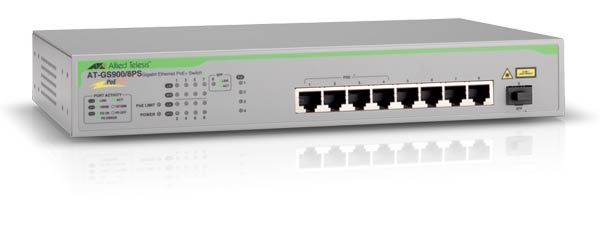 AT-GS900/8PS-50, 8xt 10/100/1000Mbps, 1x SFP UPlink, 8x Auto MDI/MDIX, 4 x PoE ports, PoE 75W, desktop, fiksna konfiguracija, 1U, unamanaged, Layer 2, mogućnost montaže na zid, interno napajanje.