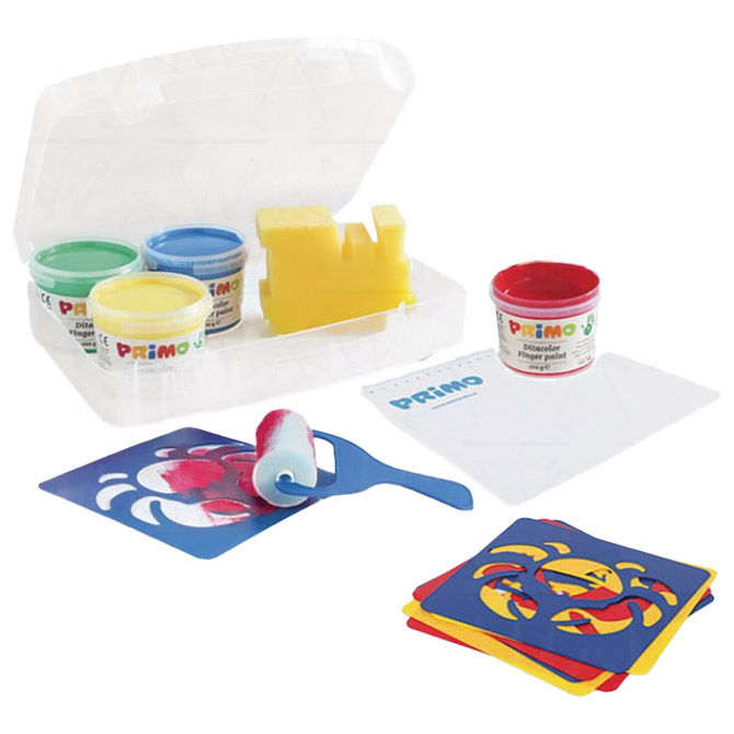 set od 4 boje x 100 g ( plava, crvena, zelena i žuta); 5 šablona, spužvasti valjak, spužvu, kist, podlogu
