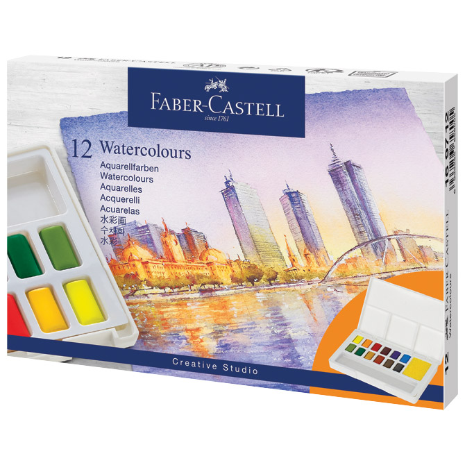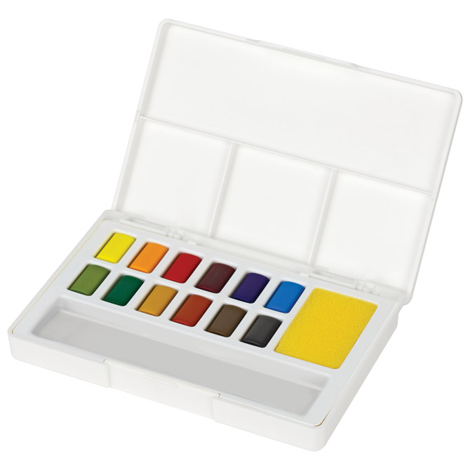 12 boja; mjesto za kist; sjajne i svijetle boje potpuno topive u vodi; savršena mogućnost miješanja svijetlih i tamnih nijansi; visoka kvaliteta pigmenta; odvojiva paleta koja se lako čisti; PVC kutija