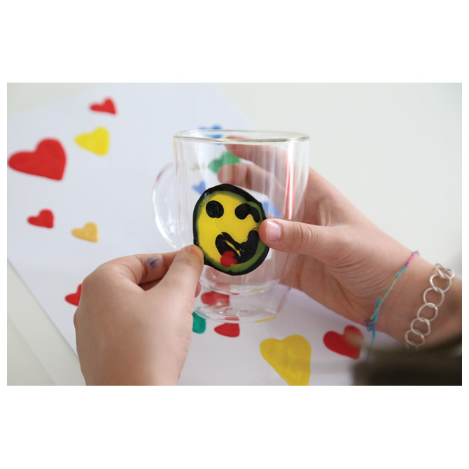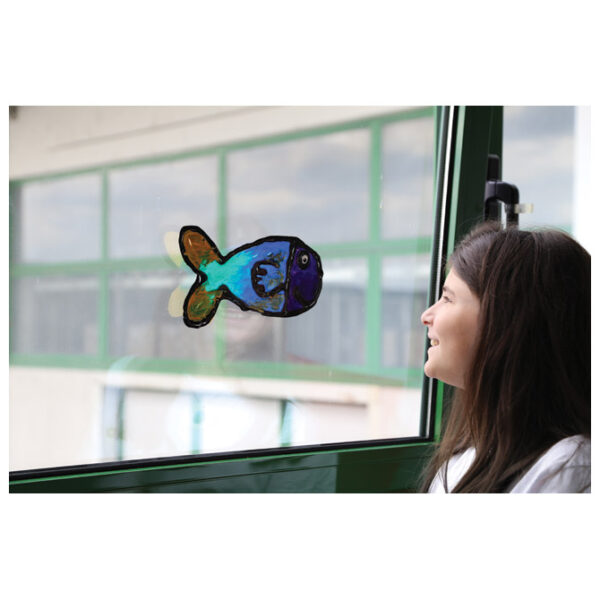 u boci s mlaznicom za kontrolu protoka; visokokvalitetna emulzija u boji idealna je za stvaranje oblika koji se mogu premještati s jednog mjesta na drugo i lijepiti se na različite vrste staklenih površina nakon što se potpuno osuše; tonove možete miješati štapićem; rezultati su uvijek intenzivni, prozirni i svijetli; jednom kad se osuši boja se ne može isprati; primjena: staviti željenu šablonu (isprintani crtež) ispod prozirne čvrste folije i konturnom bojom iscrtati konture slike, a kada se konturna boja osuši tada između nanositi željene boje; sadrži: 6 boja (bijela, crna, crvena, plava, zelena i žuta) x 75 ml, plastičnu podlogu (dimenzija: 60×80 cm), 1 list šablona i upute; u plastičnoj kutiji; sa ručkom
