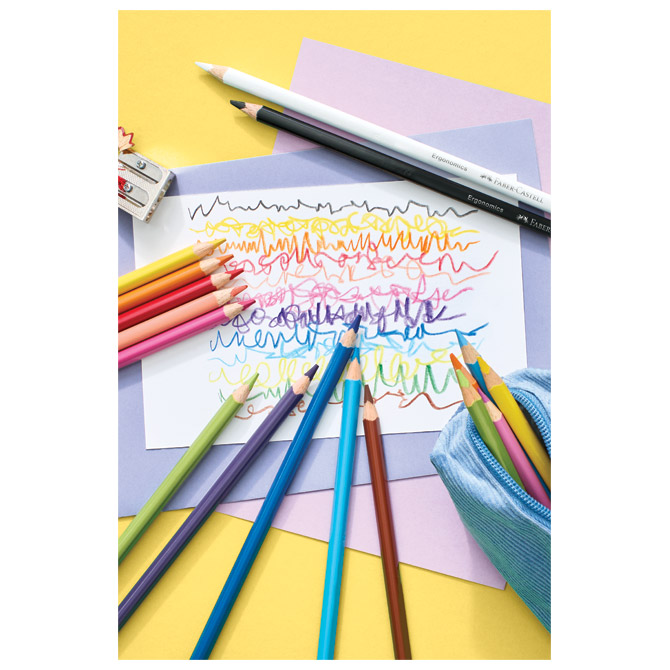 šiljene; debljina mine: 4 mm; trokutaste; ergonomske; živopisne boje; jako mekan vrh za veću pokrivenost površine papira bojanjem; posebno je otporna na lomljenje (specijalno spajana – SV); ispire se sa većine tkanina; eko olovka (drvo iz certificiranog održivog šumarstva); set od 12 boja; kartonska kutija; blister