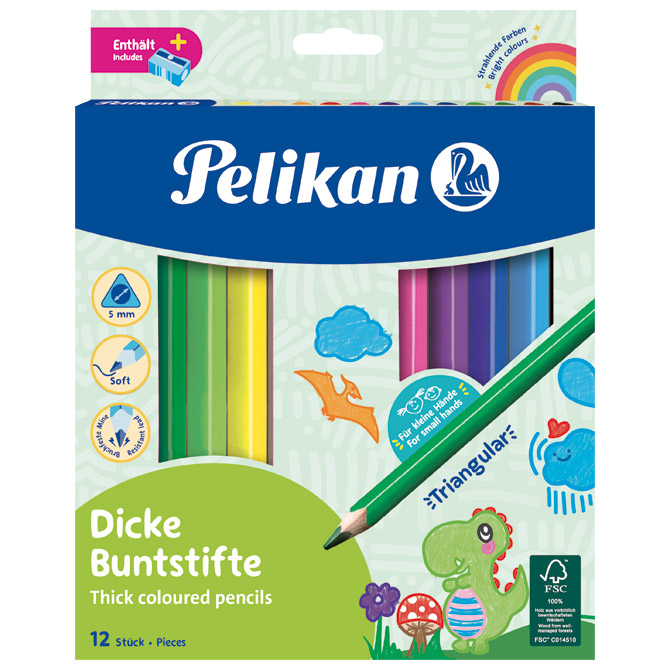 šiljene; debljina mine: 5 mm (debela mina); trokutaste; duljina: 17,5 cm; otporne na lom; set od 12 boja; šiljilo; kartonska kutija; blister
