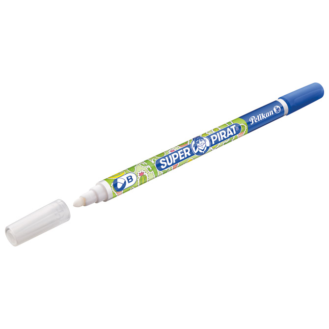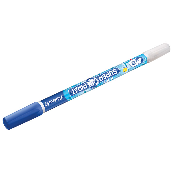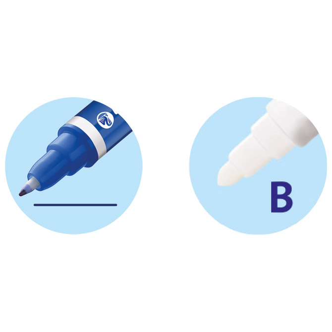 s jedne strane je brisač, a s druge strane plavi flomaster; vrh: okrugli; širina brisača B (broad – za brisanje cijelih riječi)