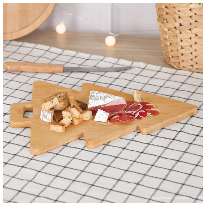 Daska za kuhanje s originalnim dizajnom božićnog drvca, izrađena od mekog bambusa, s izrezanom ručkom za čvrst hvat, vrlo jednostavna za čišćenje i skladištenje. Dim: 21 x 26.5 x 1 cm