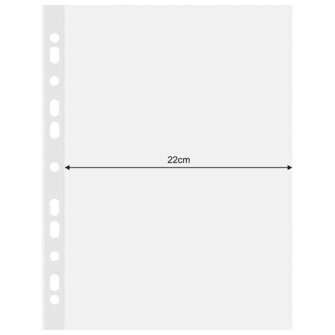 format: A4; unutrašnja dimenzija: 220×300 mm; vanjska dimenzija: 238×304 mm; PP – sjajni; debljina: 120 mikrona; univerzalna perforacija; otvor s gornje strane; set od 25 komada