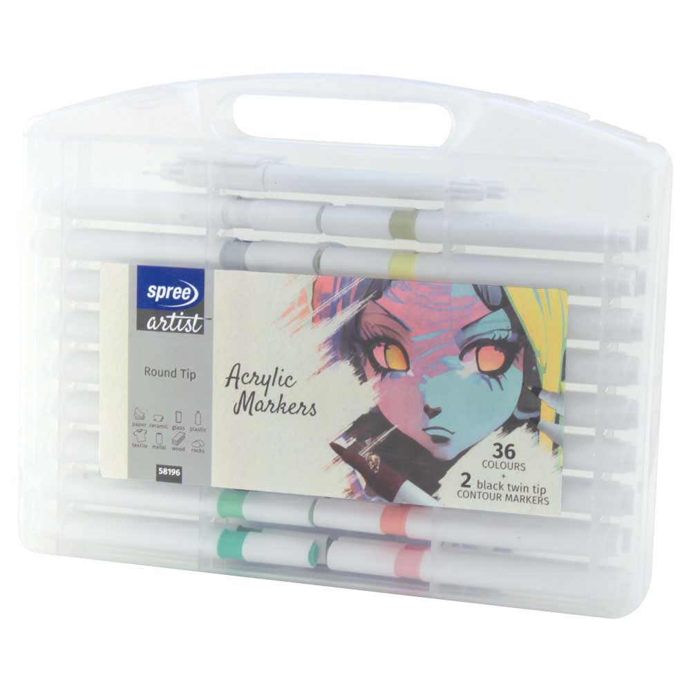 36 flomastera; vrh soft brush; svestranost primjene, mogućnost korištenja na različitim materijalima kao što su papir, tkanina, keramika, metal, staklo, drvo, plastika, kamen; jednostavan za korištenje praktičnim i preciznim vrhom poput kista; vodootporan i dugotrajan; uz pravilno korištenje akrilni markeri daju dugotrajan rezultat; dodatna 2 crna flomastra s duplim vrhom za konturiranje