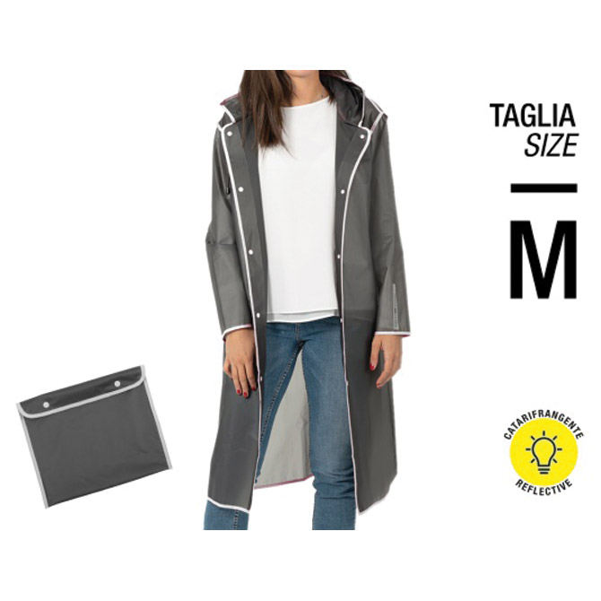 siva, reflektirajući rub, kopčanje – bijeli gumbi, kapuljača, kvalitetan EVA ( Etilenvinil acetat) materijal, pakranje u torbici, lagana, mekana, vodootporna