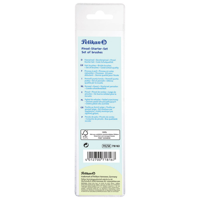 sadrži: 3 kista za vodene boje (2, 4 i 6; vlakna od prirodne pony dlake) i 2 kista za tempere (6 i 10; vlakna od prirodne dlake (čekinje)); blister