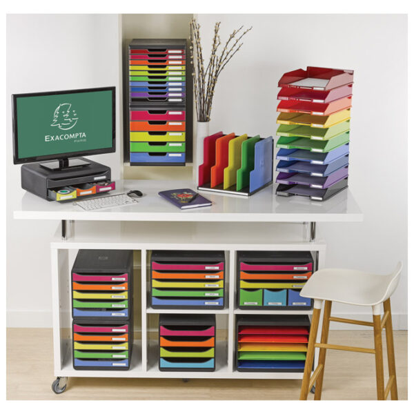 6 ladica: 3 x A4+ i 3 x A6; otvorena; dimenzija kutije: 355x271x270 mm; 3 manje ladice su idealne za pohranu predmeta kao što su: olovke, notesi, kabel, bušač.., a 3 veće ladice za pohranu dokumenata do formata A4+; za urednu pohranu stolnog pribora i uštedu prostora; idealna za dom i ured; zamjenjiva etiketa na svakoj ladici; ima sigurnosnu kočnicu za ladice; lagano otvaranje ladica; mogućnost slaganja kutija jedna na drugu; rub ladice sortirane boje za A4+: narančasta, roza i žuta i A6: plava, svijetlo plava i zelena; izrađena od reciklirane plastike (Blue Angel certifikat)