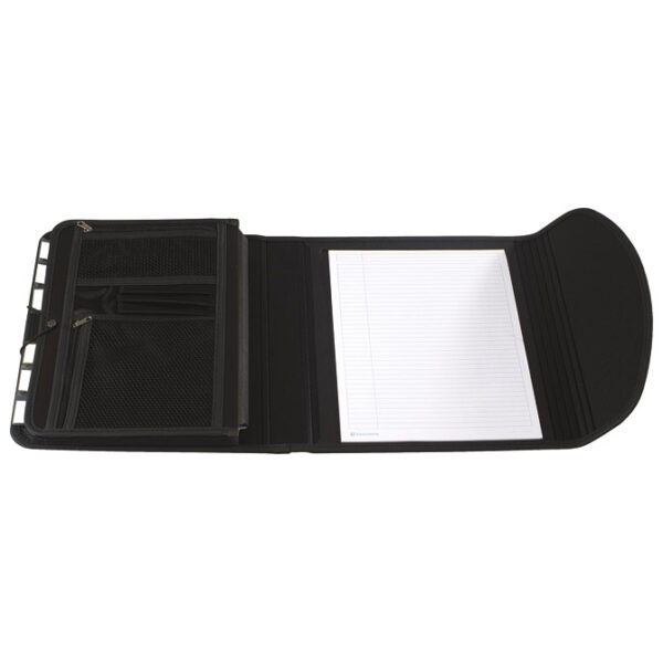 format: A4; dimenzija: 255×335 mm; reciklirani PP; sadrži: mjesto za 3 olovke, blok kolegij sa crtama, 6 pp pregrada koje se zatvaraju sa gumicom, 2 džepa sa zipom, 1 pretinac; zatvaranje na gumb