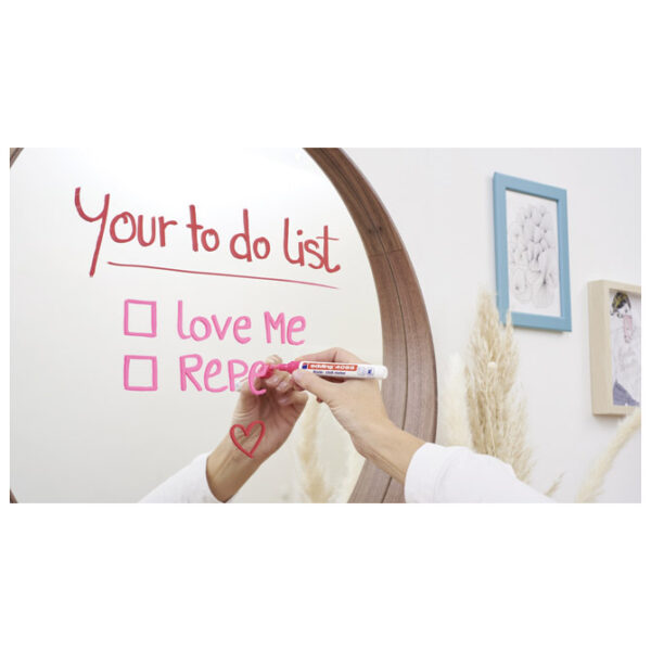 nepermanentni; okrugli vrh; širina ispisa 2-3 mm; tekuća kreda na bazi vode; otporan na svjetlo; za pisanje po glatkim površinama (staklo, prozor, tamna ploča…); briše se vlažnom krpom