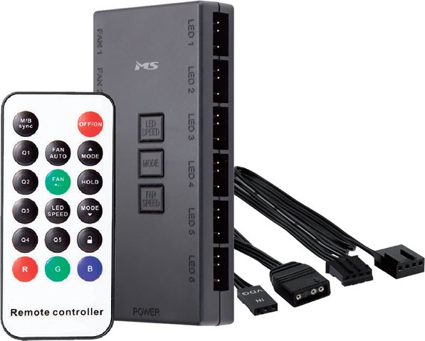 MS IMPERO P700 ventilator hub; 6 port 3pin fan hub 5V; 3pin ARGB zaglavlje + SATA; reset SW 3pin ulaz za napajanje; RF daljinski