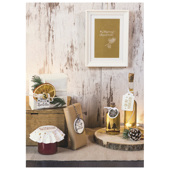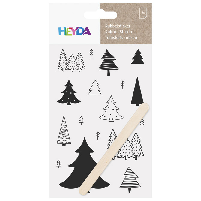 sadrži: 1 list sa motivima dimenzije: 10×19 cm i 1 drveni štapić; idealan za dekoriranje papira i kartona, također prenosiv na glatke površine poput stakla, porculana, drva i mnogih drugih u dekorativne svrhe; sa uputama (izrezati motive, odlijepiti podložnu foliju, staviti na odabrano mjesto i prenijeti trljanjem); nije perivo u perilici posuđa; blister