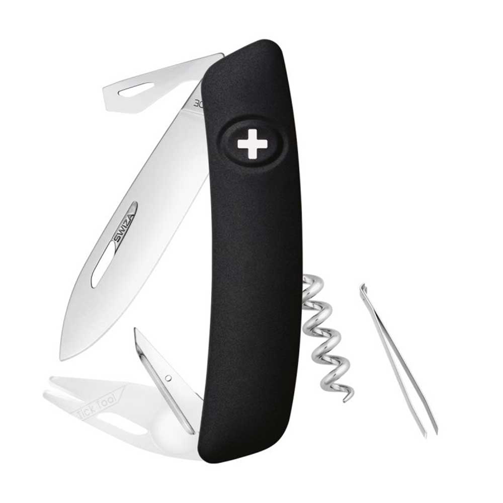 11 funkcija, oštrica od 75mm sa sigurnosnom kočnicom, svrdlo – šilo sa ušicom za šivanje, sommelierski otvarač plutenih čepova, otvarač boca sa ravnim odvijačem br. 3 i savijačem žica, odstranjivač krpelja sa povećalom, pinceta