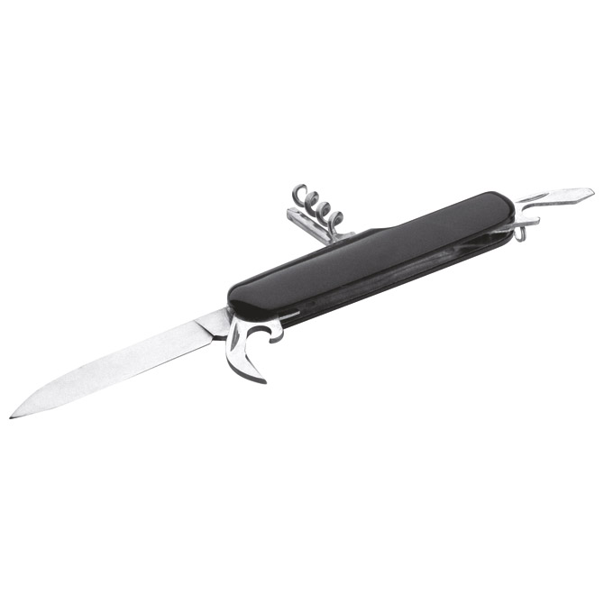 nehrđajući čelik; sadrži 7 alata: otvarač čepa za bocu, vadičep, odvijač, alkicu..; dimenzija: 9×2,5×1 cm