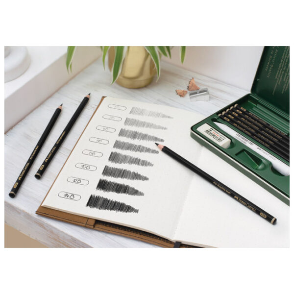 šiljena; debljina mine: 3,3 mm; bez gumice; šesterokutna; izuzetno mat grafitna olovka vrhunske umjetničke kvalitete; ultra mat grafitni ispis za smanjenje refleksije na papiru; najveća gustoća tonske vrijednosti za učinak maksimalne dubine; za pisanje, crtanje i skiciranje; posebno pogodno za jednobojne grafitne radove; posebno je otporna na lomljenje; eko olovka (drvo iz certificiranog održivog šumarstva); tijelo lakirano eko lakom na bazi vode