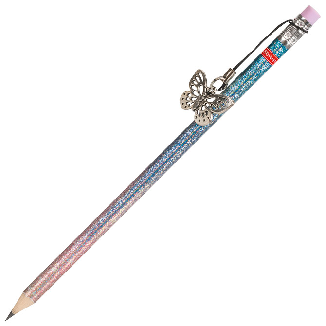 tvrdoća: HB; šiljena; okrugla; duljina: 18 cm; s gumicom; s privjeskom (leptir); s holografskim premazom koji može stvarati efekt refleksije svjetlosti