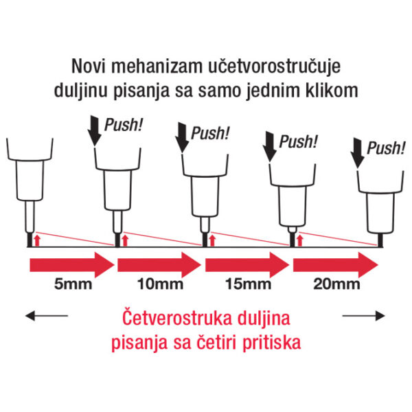 ergonomski oblikovan grip; s gumicom; metalna klipsa; sa metalnim vrhom koji se posve uvlači u olovku (sistem protiv pucanja mine); pritiskom vrha olovke mina se nadoknađuje; novi mehanizam učetverostručuje duljinu pisanja sa samo jednim klikom; kapica sa okretnim sistemom za označavanje koja mina se koristi (3H, 2H, H, HB, B ili F); 2 funkcije: za pisanje i tehničko crtanje