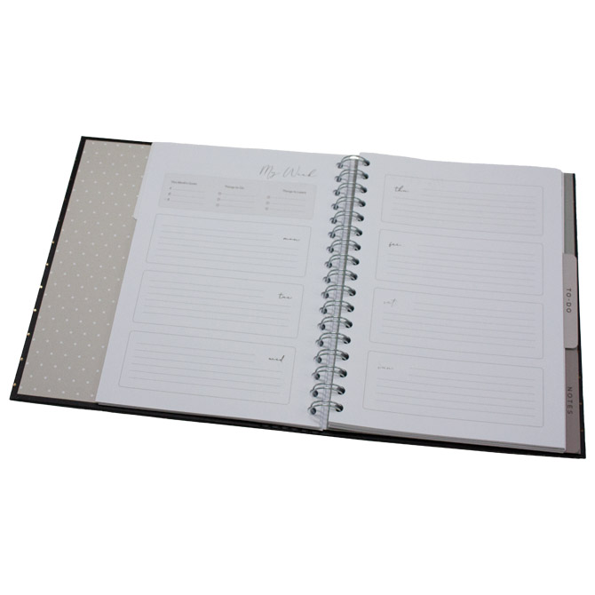 dimenzija: 18×23 cm; tvrdi uvez; 108 listova; sa gumicom; skrivena spirala; 3 pregrade (Diary, To-do, Notes)
