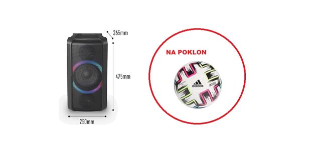 PANASONIC bežični zvučnik SC-TMAX5EG-K, Zvučni sistem 2.1, Ukupna izlazna snaga (RMS): 150 W. Umrežavanje Bluetooth, Upravljanje Apl ikacijom i ručno, Verzija Bluetooth-a V 5.0, Aplikacija Panasonic MAX Juke USB Da, Povezivanje Double USB (Play + Play), Format USB: MP3, Format CD/DVD: CD-DA / MP3, Radio: memorisanje do 30 FM stanica, AUX (PinJack) x1 / Opt-in x1, Mikrofon: x2 (6.3 mm), Ostale k arakteristike Prednji zvučnik: 6 cm, Tweeter x2, 10 cm Woofer x2, Subwoofer: 20 cm Super Woofer (Hard Press Corrugation) x2, Napajanje Strujno, Daljinski upravljač Da, Dimenzije ŠxVxD: 25 x 47.5 x 26.5 cm, Masa 20 kg. Više detalja na službenoj stranici: https://www.panasonic.com/hr/consumer/kuc na-zabava-i-hifi-uredaji/mikro-i-minisustavi/hi-fi-mikrosustavi/sc-tmax5 .html + ADIDAS lopta