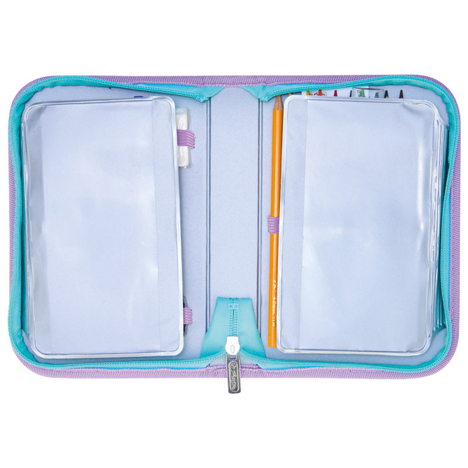1 zip; 2 preklopa; punjena s 31 komadom pribora: flomaster školski 14 boja, boje drvene 8 boja, olovka grafitna HB x 2 komada, šiljilo, gumica, ravnalo pvc, trokut, olovka kemijska; dimenzija: 20,5x14x3,8 cm