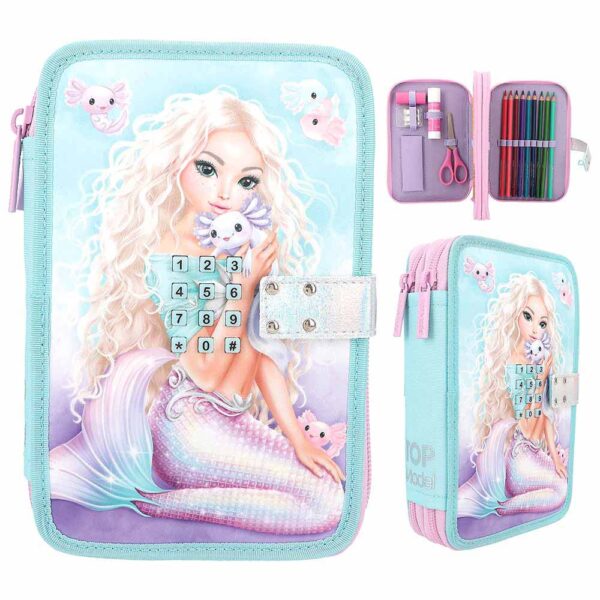 2 zipa, sadrži: 18 bojica, 2 olovke , ravnalo 15 cm, trokut, gumicu, šiljilo, ljepilo u sticku, škarice , dimenzije: 20 x 13 x 5 cm, na prednjici se nalazi tipkovnica za otključavanje , potrebno je unjieti četveroznamenkasti kod