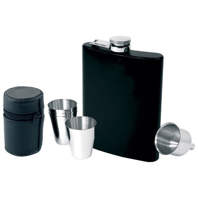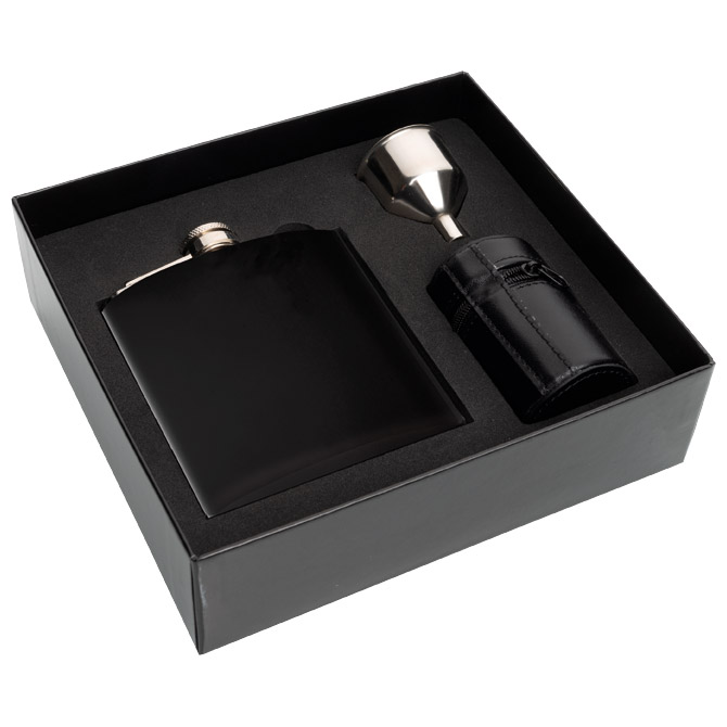 Schwarzwolf set pljoska + čaše.;Uključuje: crnu pljosku od nehrđajućeg čelika od 237 ml, 4 čašice (30 ml) u crnoj vrećici i lijevak. Pakirano u poklon kutiji. Volumen: pljoska 237 ml, čašice 30 ml; Materijal: nehrđajući čelik; Dimenzije: pljoska 9,5×14,6×2,5 cm, čašice u vrećici 4×6,5 cm.