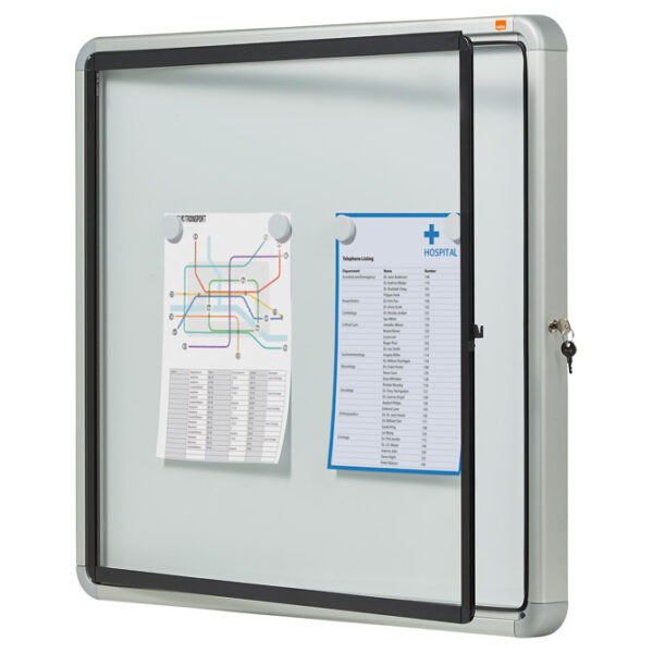 može se koristiti unutar i van zatvorenih prostora; vodootporna; aluminijski okvir; staklena krilna vrata (4 mm); set tipli i vijka za postavljanje na zid; držač za markere i brisač; mogućnost zaključavanja (2 ključa)