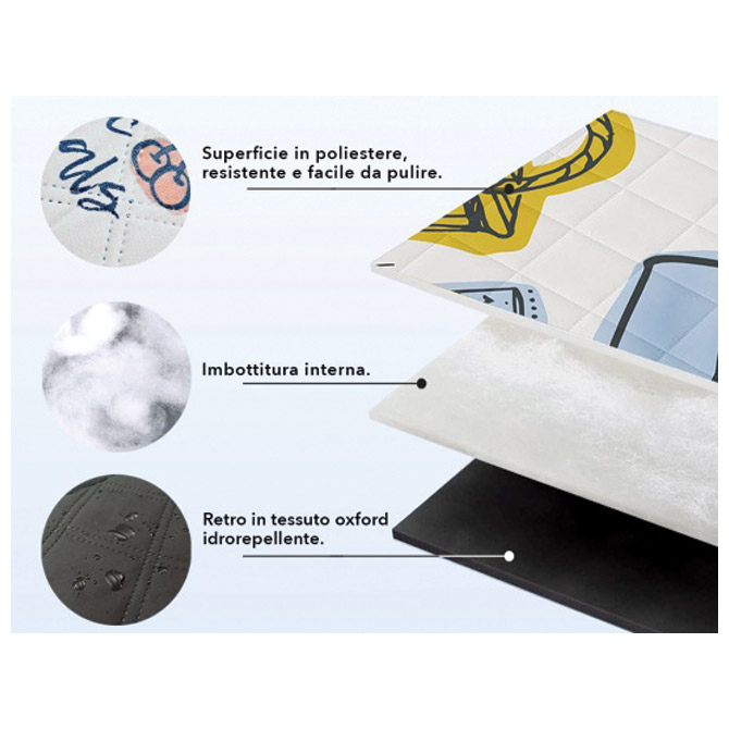 Preklop s čičak trakom za jednostavno sklapanje i nošenje; troslojna; donja starna vodootporna; prva strana polyester-lako za čišćenje; dim. složene podloge: 35x25x10cm; dim. otvorene podloge 200cmx200cm