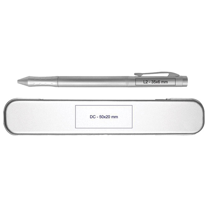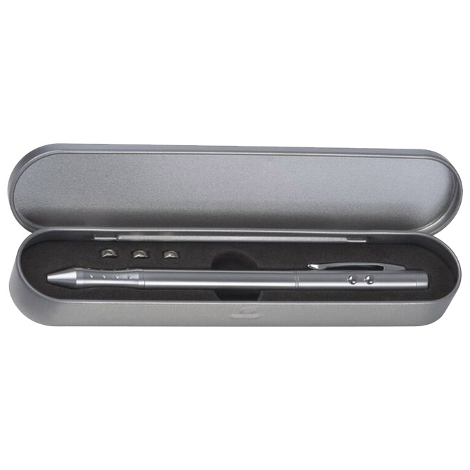 4 u 1 laserski pokazivač; metalna kemijska olovka s crvenim i plavim uloškom za pisanje, laserskim pokazivačem i LED diodom; pakiran u metalnu kutiju; uključuje tri gumbaste baterije