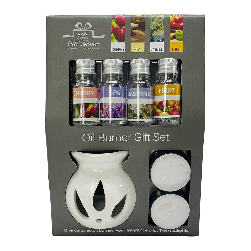 Poklon set sadrži isparivač eteričnih ulja, 4 mirisa i 2 čajne svijeće