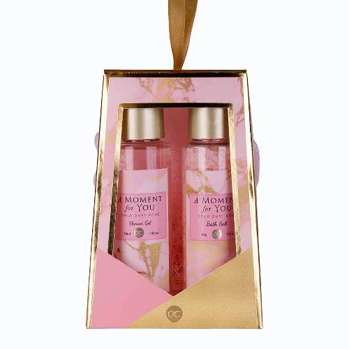 set sadrži: gel za tuširanje 50 ml, sol za kupanje 60g, mrežasta spužvica za pranje 15g, u papirnatoj poklon kutiji, miris Gold Dust Rose