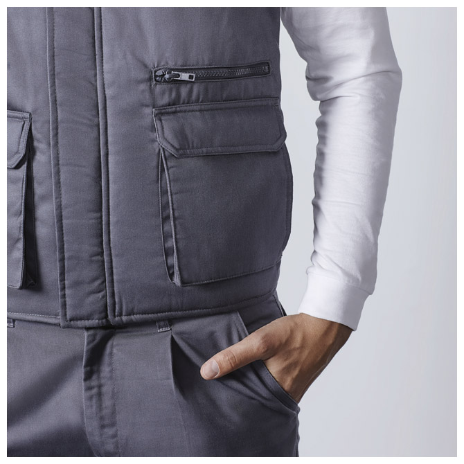 muški; na zip; dodatno zatvaranje na čičak; duža leđa; 3 džepa na preklop, 1 džep na zip te 2 džepića za olovke s vanjske strane i 1 džep sa zatvaranjem na čičak s unutarnje strane; 2 remenčića za podešavanje širine leđa; 200 g/m2; sirovinski sastav: 85 % poliester, 15 % pamuk i unutrašnja strana 100 % poliester