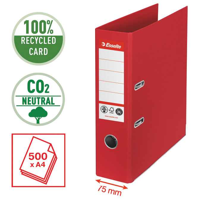 format: A4; kapacitet: 500 listova 80 gramskog papira; hrbat sa samoljepljivom etiketom; izrađen od 100 % recikliranog kartona te je 100 % reciklirajući (CO2 neutral – bez emisije CO2 – nema utjecaja na klimu); metalna šina na donjim rubovima, bočno zatvaranje i rupa za prst na hrptu za jednostavno rukovanje i sigurno skladištenje dokumenata; patentirani mehanizam s izvanrednom silom za dosljedno precizno zatvaranje; zajamčeno pouzdano zatvaranje čak i nakon 10 000 korištenja (3 godine garanicije na mehanizam s GS i LGA certifikatom); ekološki certifikati: Climate Neutral, FSC i Blue Angel; proizveden u Europi