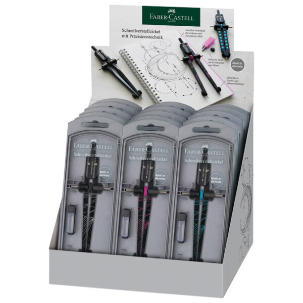 s preciznim podešavanjem; najveći promjer kružnice 340 mm; sadrži i tubu mina; 3 boje: crna/roza, crna/srebrna i crna/tirkizna; PVC kutija; blister