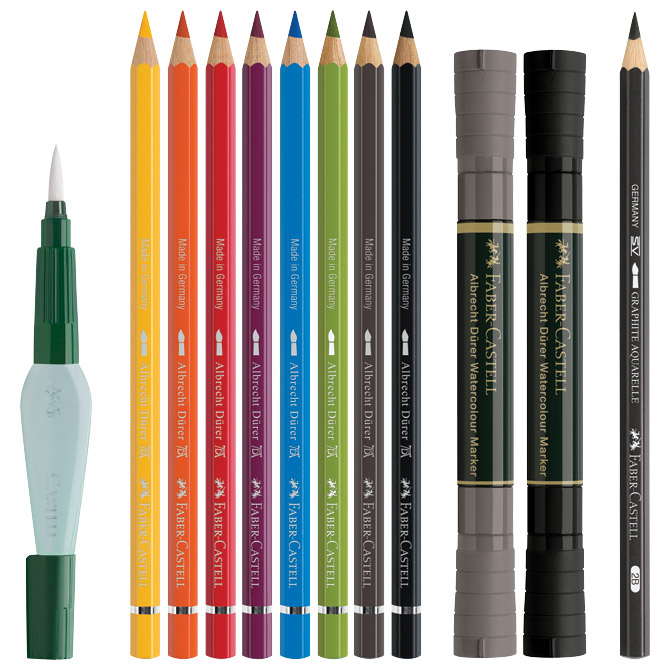 sadrži: 8xboje drvene-vodene Albrecht Dürer; 2xmarker obostrani akvarel(sivi i crni); 1xkist sa spremnikom za vodu; 1x olovka grafitna Aquarelle(2B)