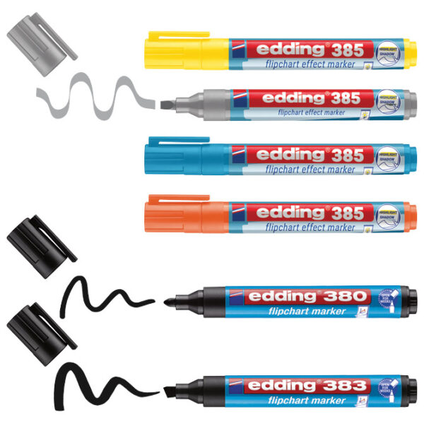 set sadrži: e-385 žuti, sivi, svjetloplavi, narančasti za signiranje i sjenčanje; e-380 u crnoj boji za vizualizacije; e-383 u crnoj boji za pisanje