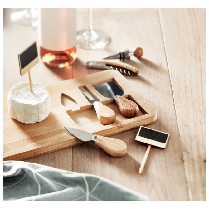 izrađen od bambusa; sadrži 4 dijela: 2 noža za serviranje, vilica i daska za rezanje; dimenzija: 37,5×17,5×1,5 cm