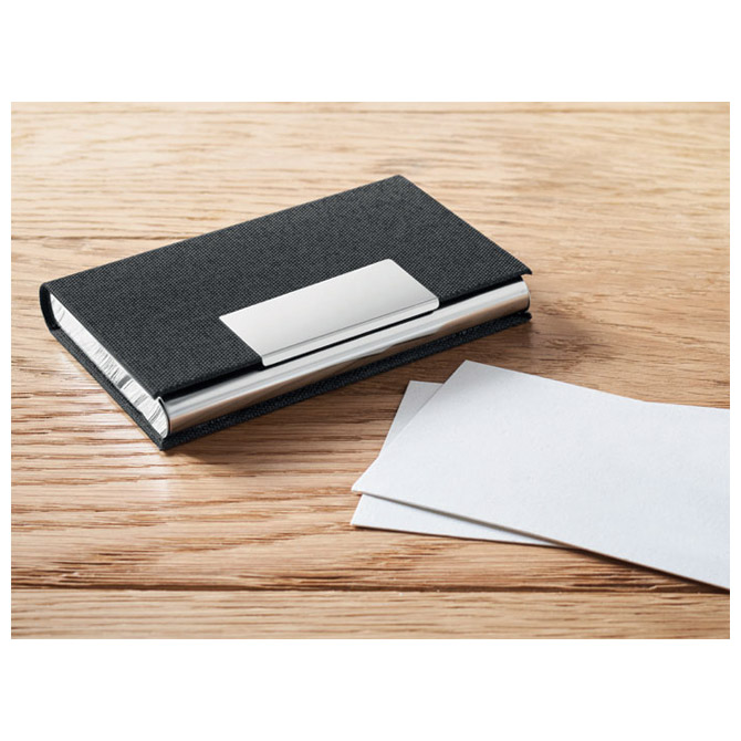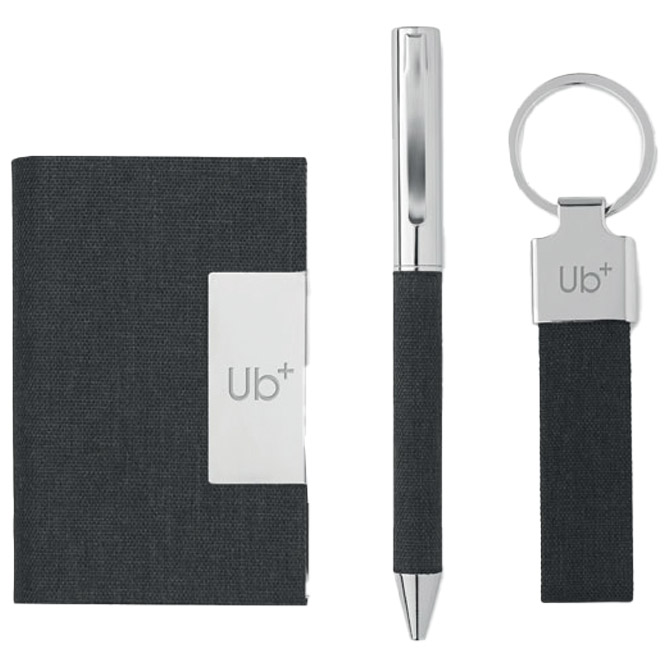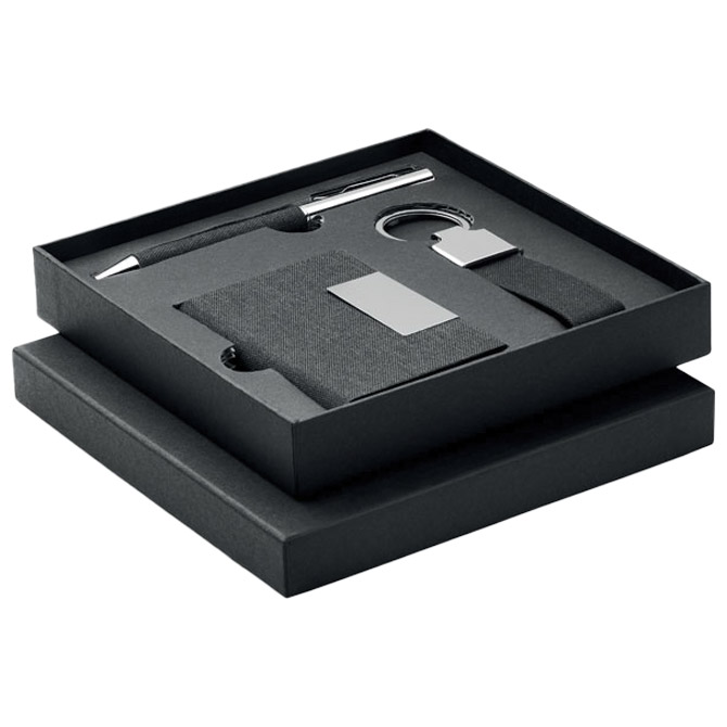 Poklon set od 3 dijela u poklon kutiji. Uključuje metalnu kemijsku olovku s RPET poliester detaljima, privjesak za ključeve od RPET poliestera i futrolu za kartice od RPET poliestera s metalnom pločicom. Dim:16x16x2,7cm