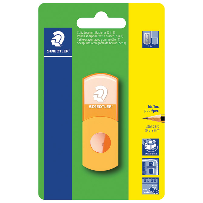 sadrži: šiljilo (1 rupa; za olovke standardne debljine do fi: 8,2 mm sa kutom šiljenja od 23° za precizno pisanje, zahvaljujući lakoj rotaciji šiljilo je jednostavno i sigurno za korištenje i ponovno zatvaranje) i gumicu (bijela, bez ftalata; bez lateksa; sa zaštitnim poklopcem)
