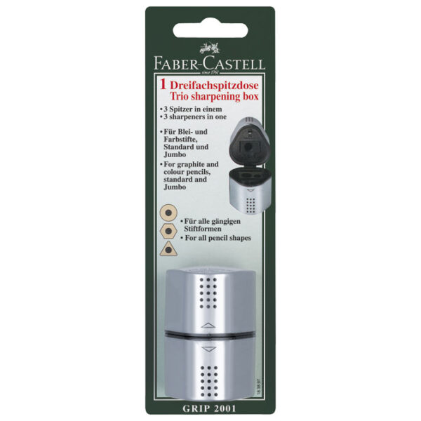 PVC; s PVC kutijom; 3 rupe; visokokvalitetno; ergonomsko; trokutasto tijelo; s patentiranim gripom za sigurno, ne klizno držanje; za trokutaste, šesterokutne i okrugle olovke standardne debljine i Jumbo (grafitne i drvene bojice); poklopac sprečava ispadanje otpada; sa velikim obostranim spremnikom za ostatke