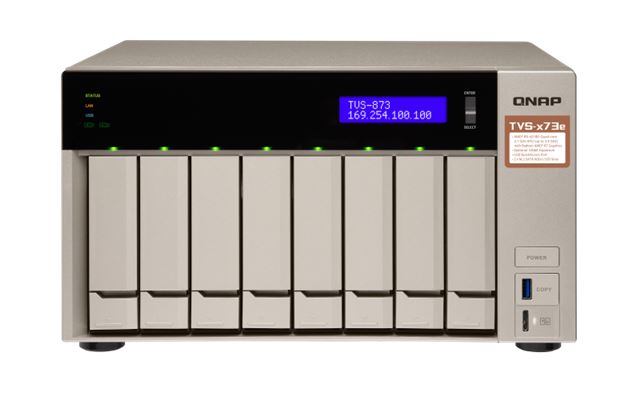 TVS-873e-8G, AMD R-Series RX-421BD quad-core 2.1 GHz processor, Turbo Core up to 3.4 GHz, 8 GB DDR4 (2 x 4 GB), 512MB Flash (max 64GB mem), 0 HDD max 8x 2.5”/3.5” SATA HDD,JBOD RAID 0/1/5/6/10, RAID 5+Hot Spare,4x USB 3.0, 4 x RJ45, jam2g