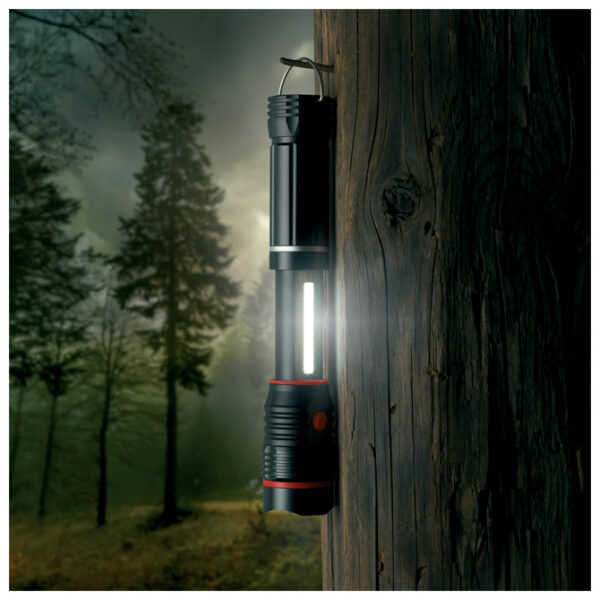 Schwarzwolf vanjska metalna svjetiljka. Sadrži Cree XPE diodu i produžnu COB diodu koja omogućuje vrlo intenzivno osvjetljenje. Na kraju svjetiljke je magnet i kuka za vješanje. Pakirano u Schwarzwolf poklon kutiju. Svjetlina: Cree XPE dioda 130 lumena, COB dioda 180 lumena. . . Dimenzije: 16,7 × 4 cm, rastezljiva duljina 22,8 cm. Baterije 4 × AAA uključene.