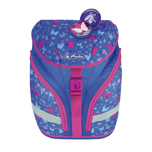 materijal: poliester; dimenzije: 30 x 38 x 26 cm; anatomska prozračna leđa, podesive podložene naramenice; prostrani glavni pretinac sa dijelom za knjige; dva dodatna džepa sa zipom sa strane, dijelovi s reflektirajućim i fluorescentnim materijalom; magnetno zatvaranje kopče; dvije zamjenjive aplikacije; plastično dno; vodonepropustan materijal; sadrži: pernicu sa 16 dijelova, praznu pernicu, vrećicu za papuče; težina torbe cca 900 g
