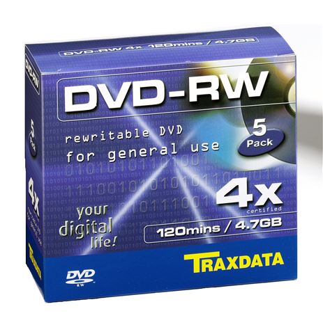 Traxdata DVD-RW optički diskovi velikog kapaciteta idealni su za snimanje podataka i njihovo presnimavanje, arhiviranje i playback. Traxdata koristi u svijetu priznate organske boje visoke kakvoće, koje osiguravaju dugotrajnost i pouzdanost, što ovaj medij čini cjelovitim i svestranim rješenjem za pohranu podataka. Pakiranje: 5 kom u zasebnim kutijama, kapacitet 4.7 GB, brzina 4X.
