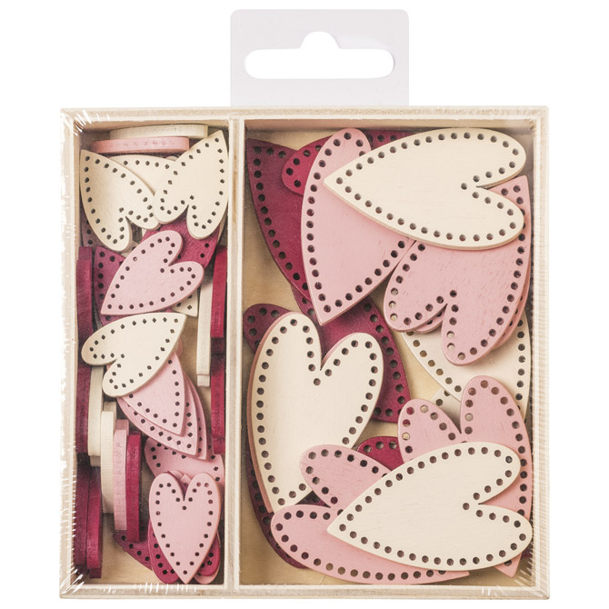 za dekoriranje i izradu raznih ukrasa; u drvenoj kutiji dimenzije:10,5×10,5 cm; prednja strana je prekrivena folijom tako da se vide motivi; set od 54 komada; blister