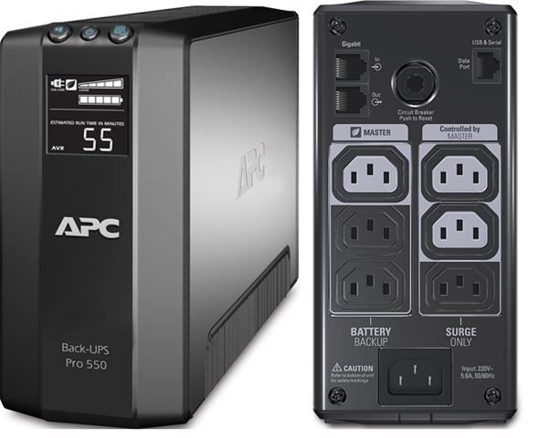 Back-UPS RS 550VA/330W Tehnologija Line interactive AVR, Stepped sinewave, Ulazni napon 176-282V, Vrijeme punjenja 12h, Vrijeme rada (50% load) 10 min, Vrijeme rada (100% load) 3 min, 3+3 utičn, Lan zaštita, USB Serial, LCD, bat APCRBC110