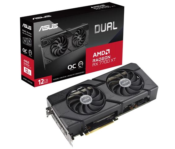 DUAL-RX7700XT-O12G, AMD Radeon, RX7700XT, PCIe 4.0 x16, 16384, GDDR6, 192-bit, 2.226 MHz, Takt memorije 18.000 MHz, 3x Display port 2.1, 1x HDMI 2.1, 7680×4320